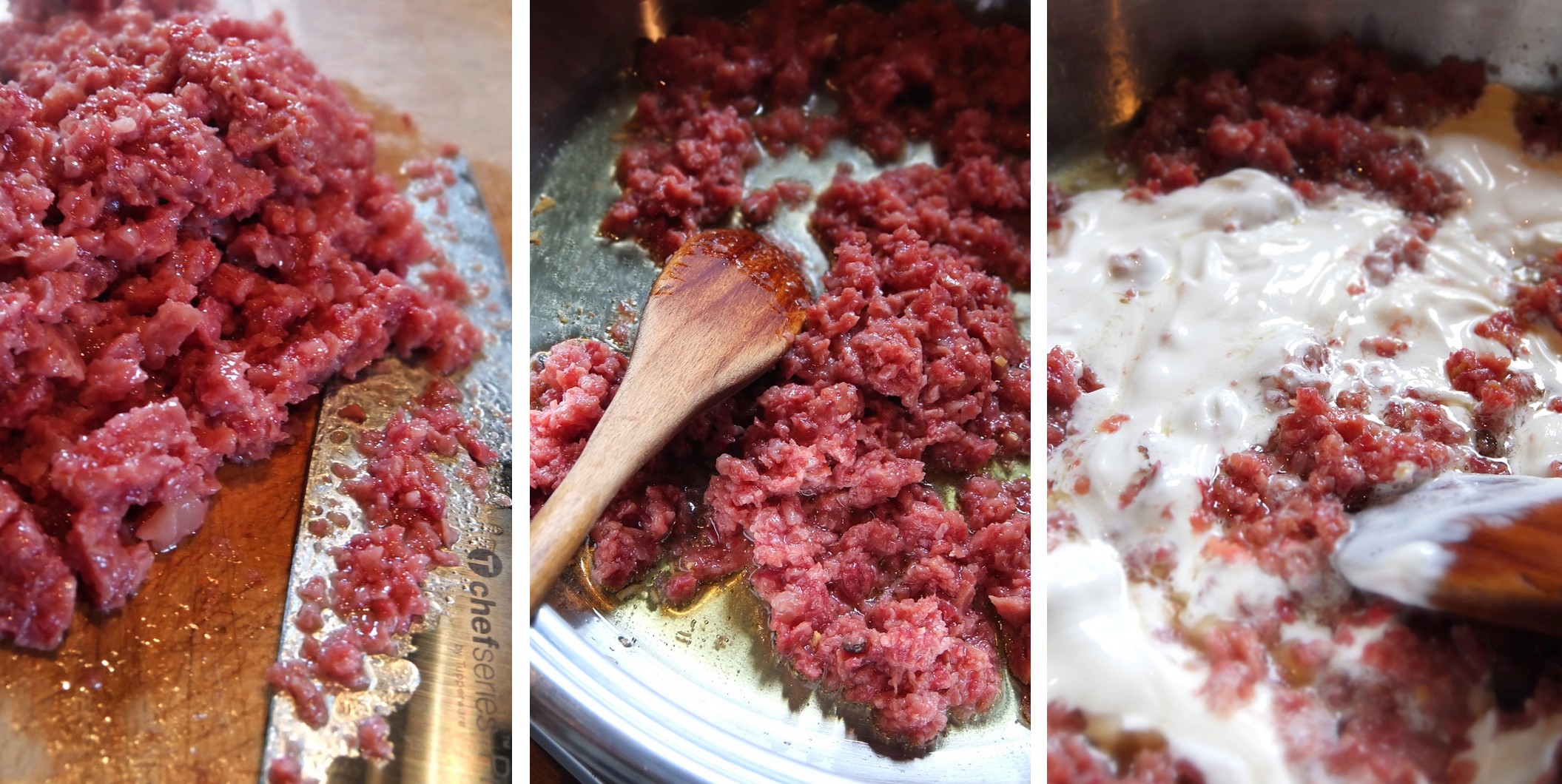 ho ridotto in poltiglia il salsicciotto dopo averlo privato della sacca; ho soffritto mezzo aglio tritato e unito la carne e la panna.