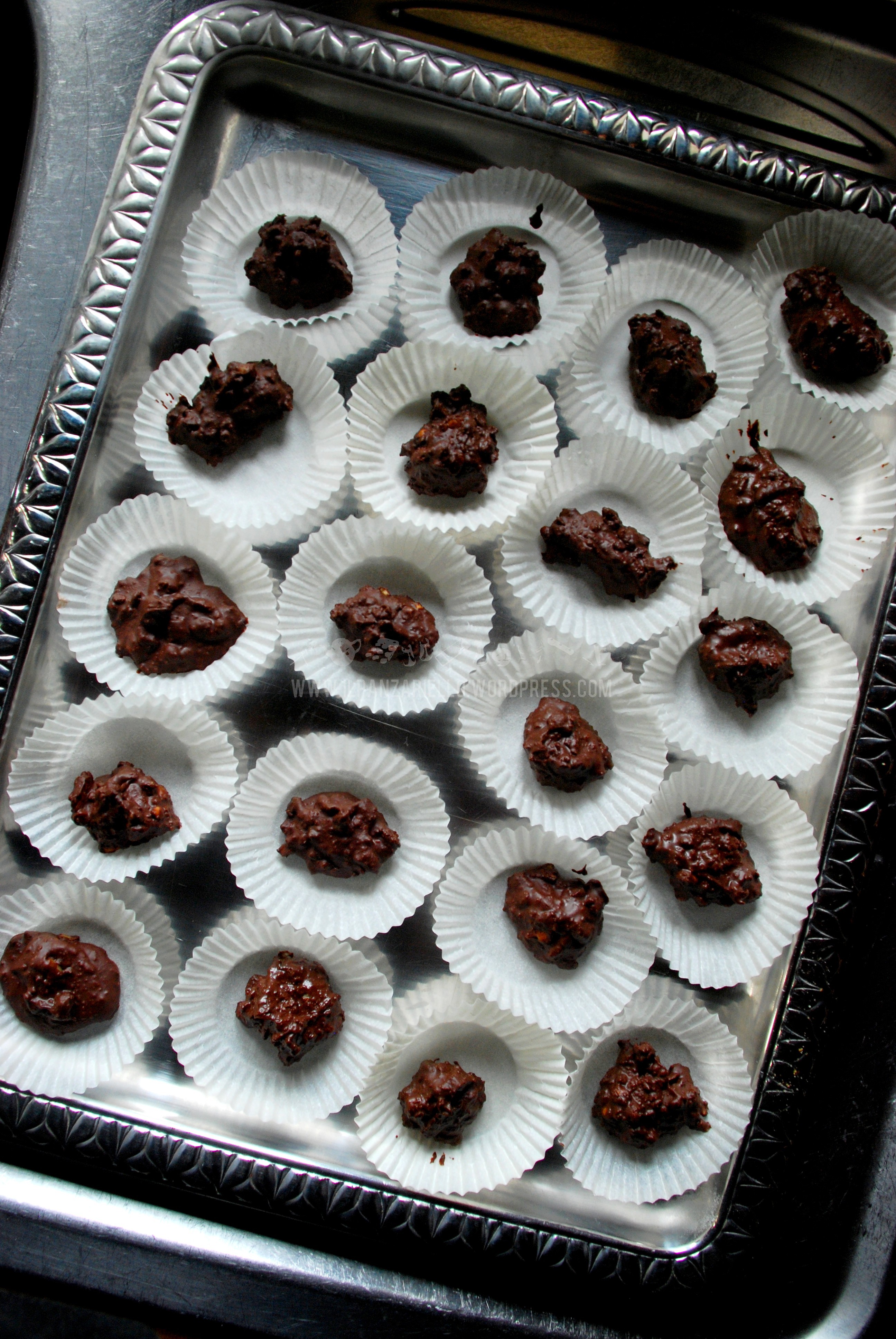 Sciogli a bagnomaria una tavoletta di cioccolato fondente al 75%, unisci una manciata di pinoli (o, se preferisci, mandorle, nocciole, noci) e dei biscotti secchi sbriciolati finché non otterrai un impasto abbastanza compatto.