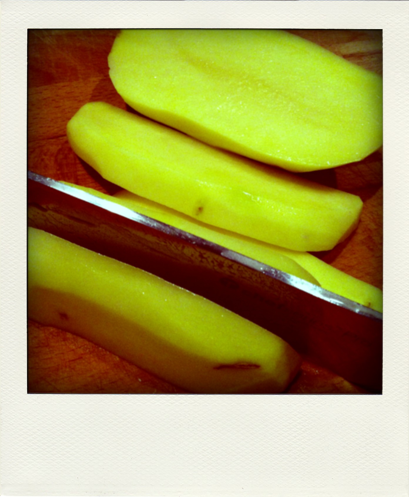 Nel frattempo pelo le patate (circa 2 di media grandezza), ne taglio 1⁄4 a tocchetti piccolissimi e li metto a bollire assieme al latte.