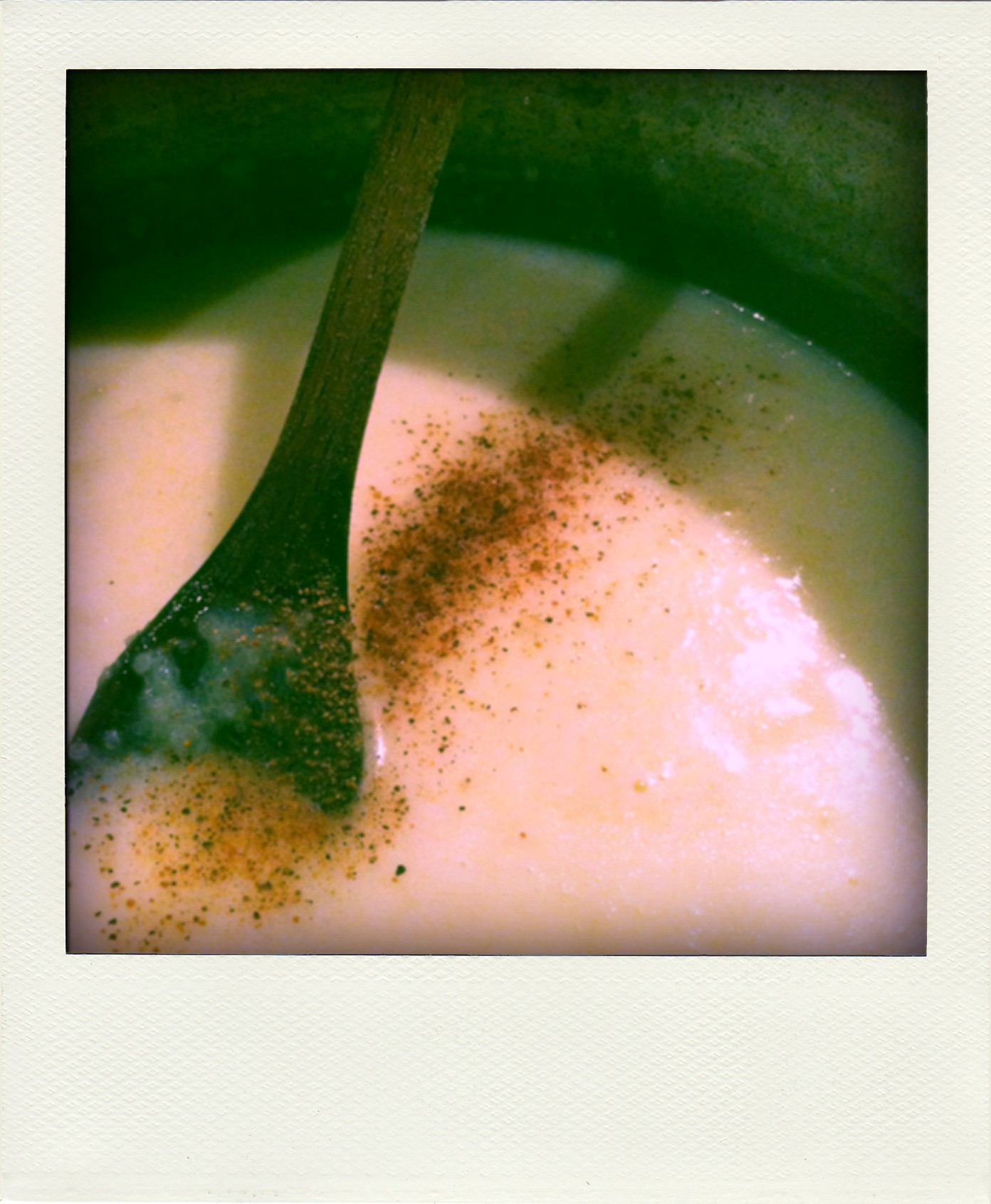 Metto a bollire 4 tazze di latte intero (200 ml ca.) e un bicchiere di acqua con due tocchetti di burro e un pizzico di noce moscata.