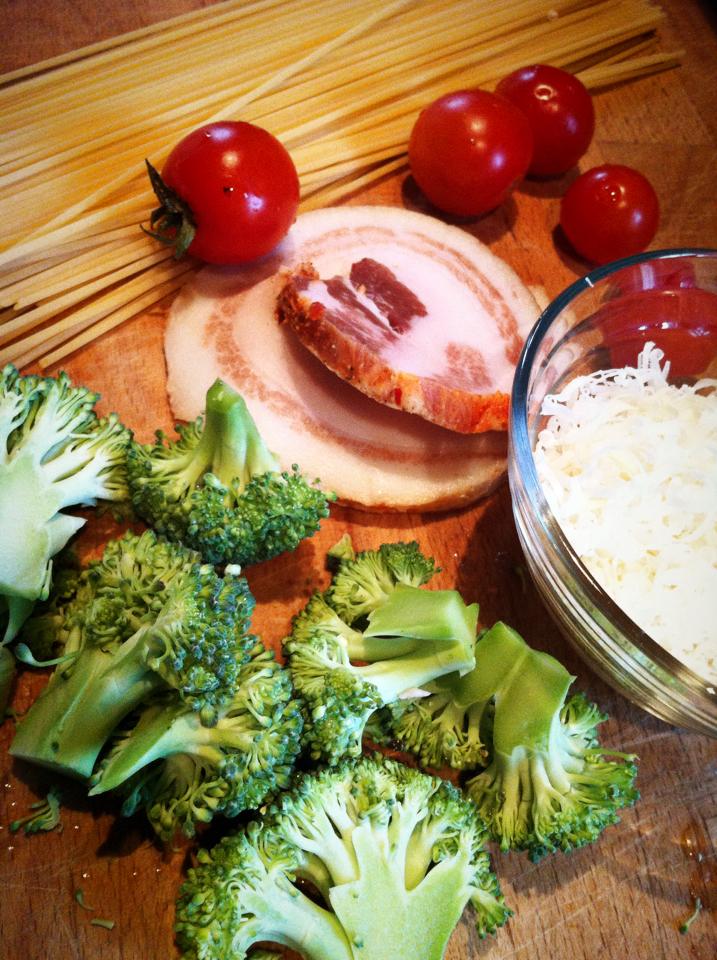 In una padella metto a rosolare con l’olio i broccoli tagliati finemente (quasi battuti al coltello). Una volta ammorbiditi, aggiungo il latte e il formaggio e continuo la cottura a fuoco vivo, aggiungendo anche i pomodori.