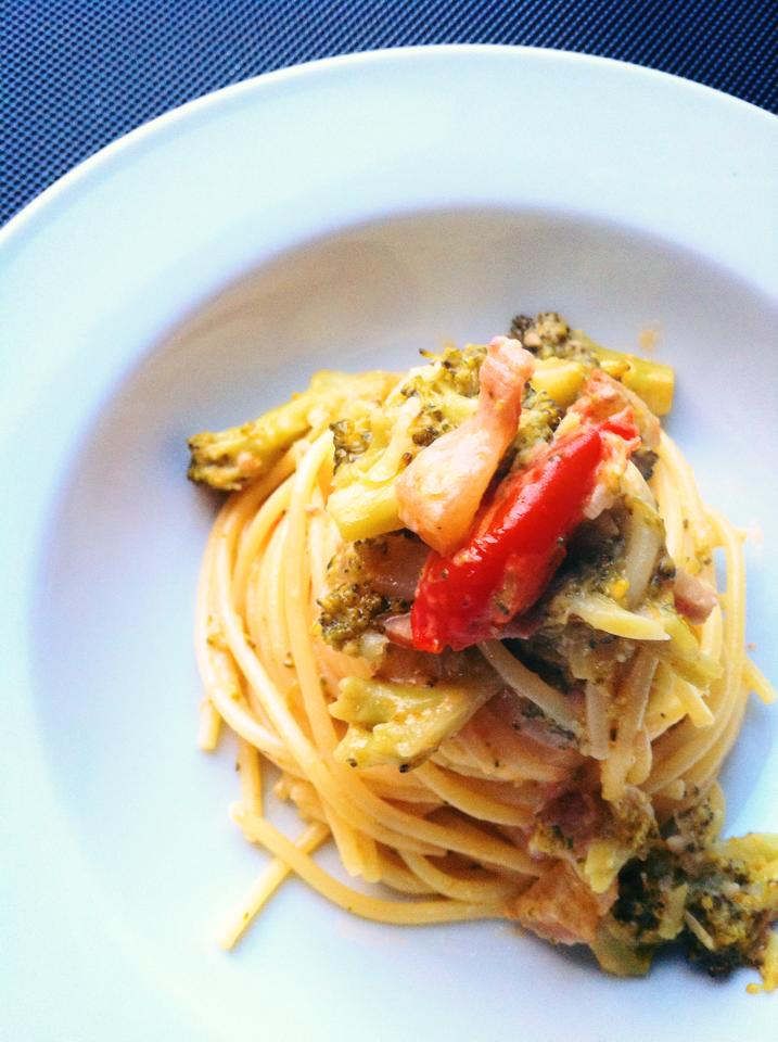 Scolo la pasta (non troppo bene) al dente e spadello il tutto per altri 2 minuti, aggiungendo il burro e la pancetta (conservo qualche listarella per ‘decorazione’ -nella foto manca, c’ho pensato dopo, pardon.).