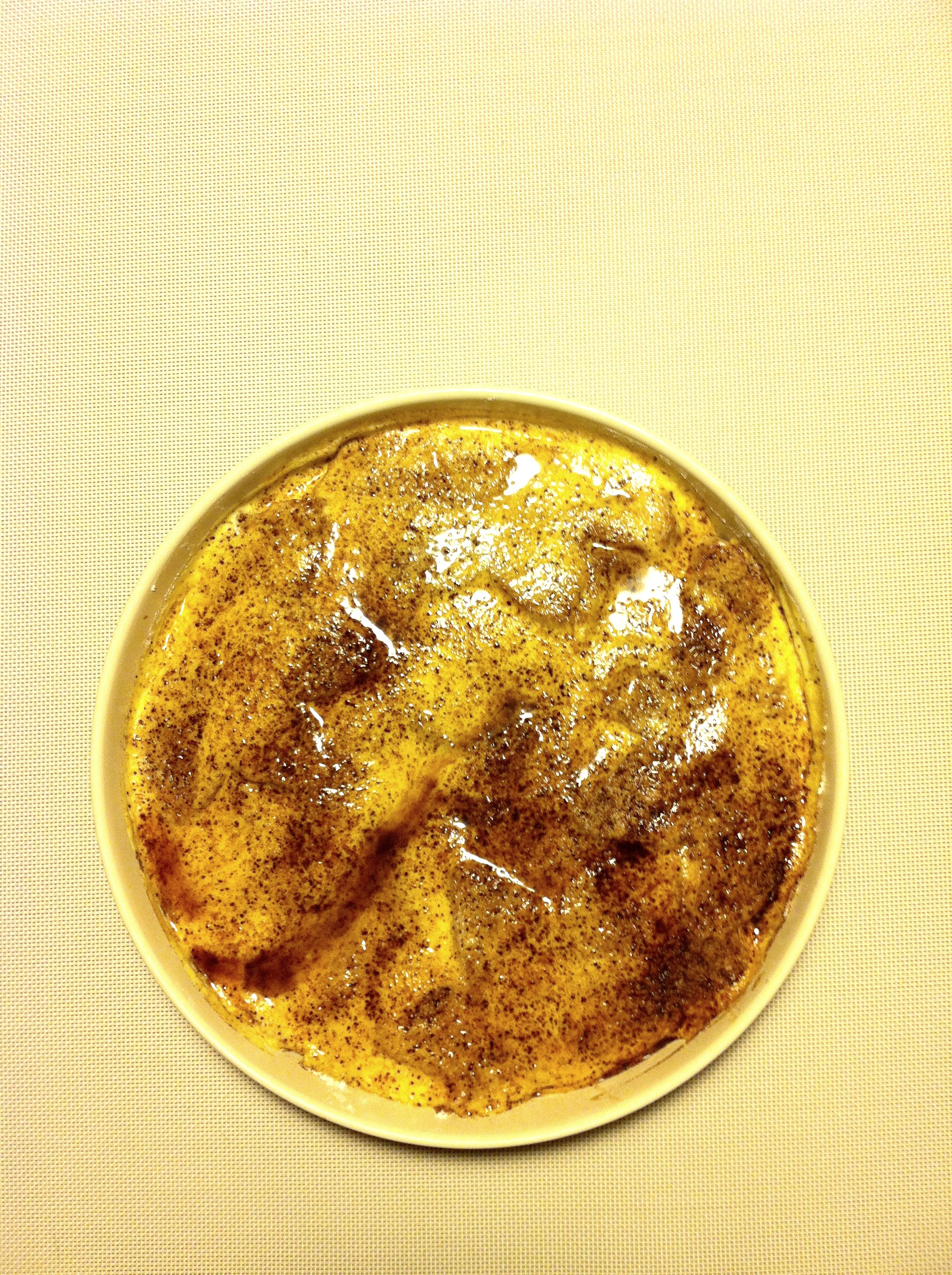 In una tortiera, inizio a comporre gli strati: una fetta di pandoro, il latte e caffè a bagnarla (uso un cucchiaio), la crema di mascarpone, zucchero a velo e cacao e via daccapo.