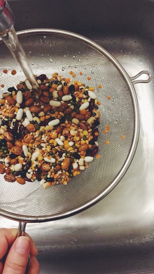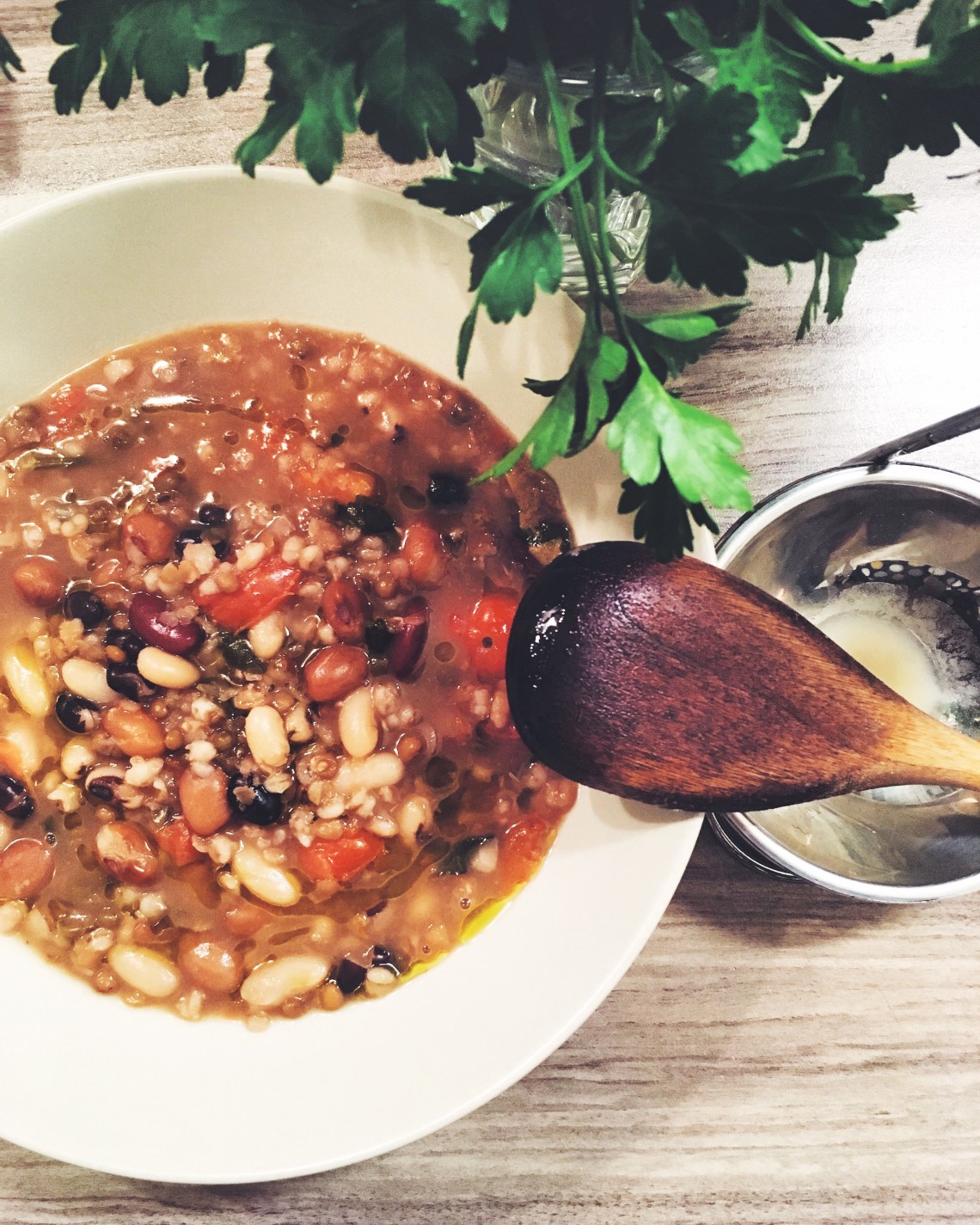 (ma anche piselli secchi, fagioli dell’occhio, fagioli cannellini, lenticchie gialle… L’importante è non usare ceci e mais -troppo duri i primi, troppo predominante di sapore il secondo-), per un totale di circa 100 gr per commensale.