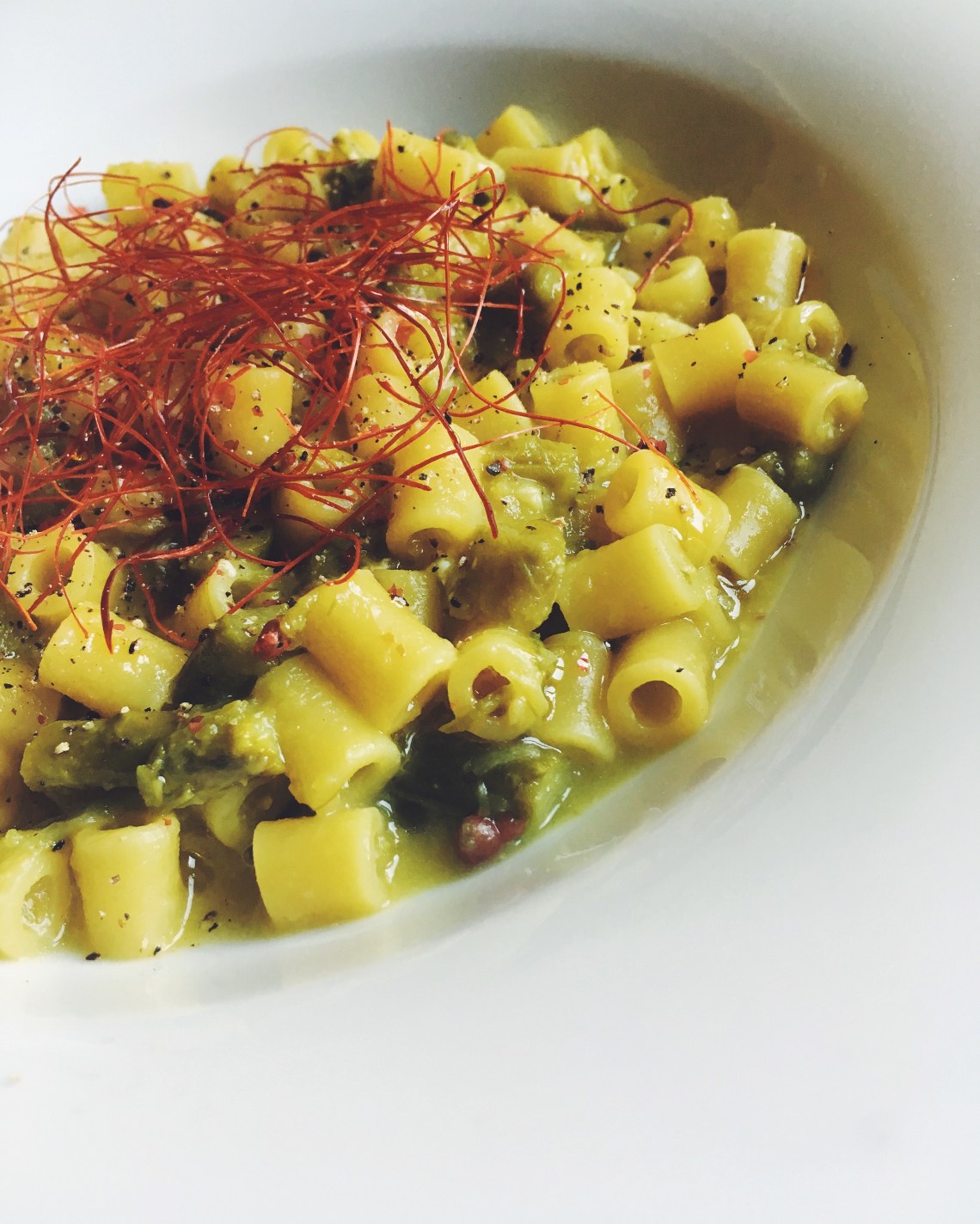 Dopo 15 min, aggiungo burro e Parmigiano Reggiano, manteco per pochi secondi su fuoco vivace e servo con un filo d’olio evo e fili di peperone dolce secco.