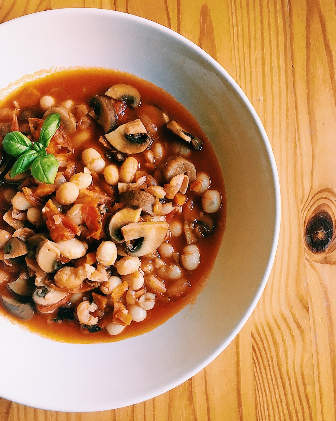 Dopo averli lasciati in ammollo per 8/10 ore in abbondante acqua fredda, metto a bollire i fagioli (in acqua fredda), con metà cipolla, una carota, mezzo spicchio d’aglio e le foglie di alloro. Serviranno 2 ore di cottura a fuoco lento (salerò solo 15 minuti prima di spegnere il fuoco). In una padella, soffriggo con poco olio l’altra metà dello spicchio d’aglio schiacciata, l’altra metà della cipolla tritata e una carota a tocchetti piccoli. Aggiungo i pomodorini tagliati a metà e, una volta appassiti, i funghi tagliati a fettine e il concentrato di pomodoro. Aggiusto di sale.
