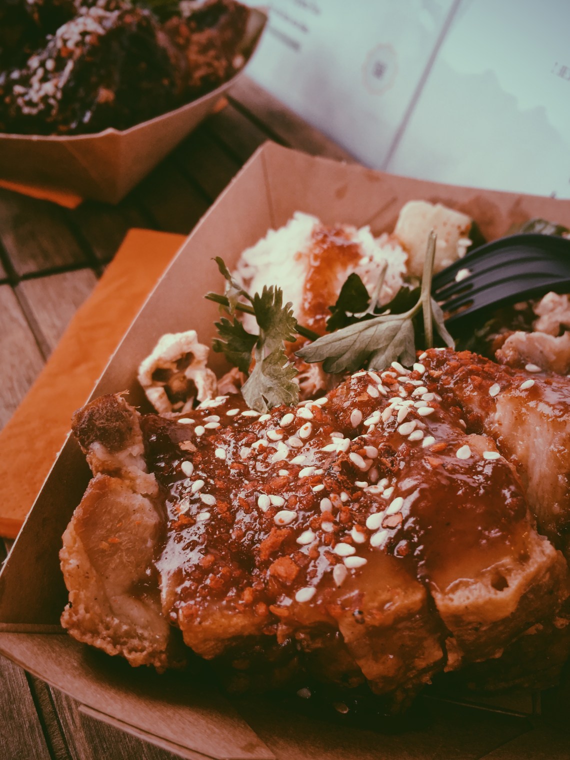 Crispiness of pork – Pancia di maiale croccante con glassa al tamarindo e lime, riso jasmin, cetriolo asiatico e sesamo tostato • Adobo – chicken und philiphinischen fusion food