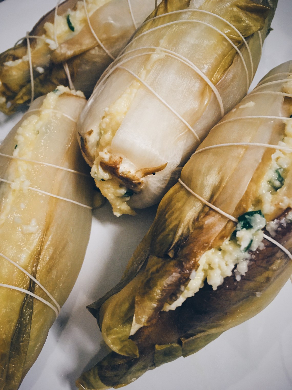Ho sbollentato in acqua salata le indivie tutte intere (8 cespi medio-piccoli, per 4 persone); le ho poi lasciate raffreddare e scolare a testa in giù.