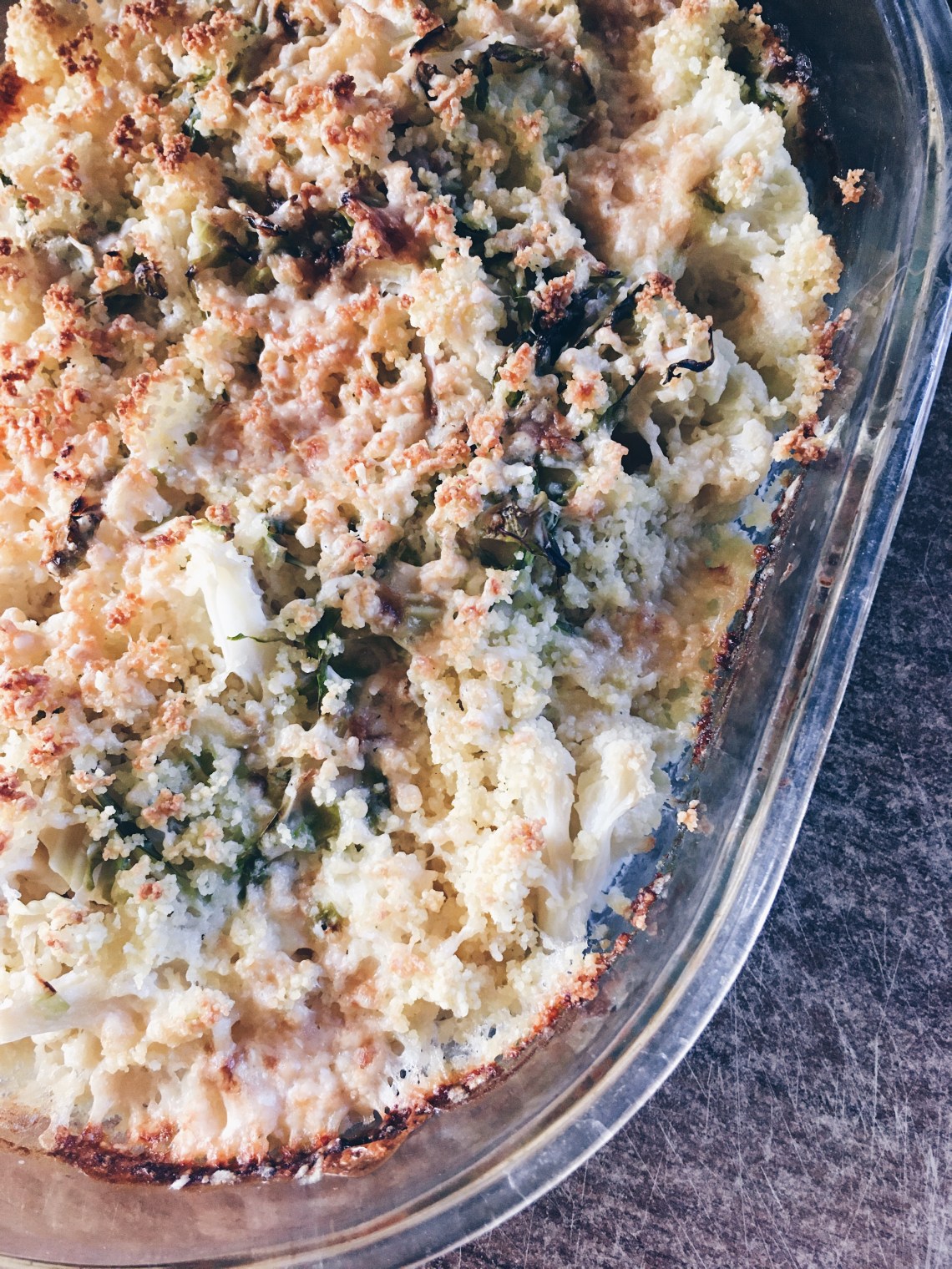 Ho cotto le roselle di un cavolfiore e le sue foglie tenere al vapore (bastano 5 min). Nel frattempo ho preparato il cous cous col metodo “pilaf” (1 tazza di cous cous in 2 tazze di acqua bollente, coperto e a fuoco spento, senza mai mescolare –sarà pronto anche questo in 5/7 min–). Ho lavorato la ricotta con un cucchiaio di curcuma fresca grattuggiata (se avete quella in polvere, basterà un cucchiaino), un pizzico di sale e del pepe. Ho poi composto gli strati nel pyrex: roselle di cavolfiore, giro di olio, ricotta, cous cous, le foglie del cavolfiore tagliate a julienne, parmigiano e spolverata di cous cous. In forno a 180º per 30 min (gli ultimi 5 con il grill acceso).