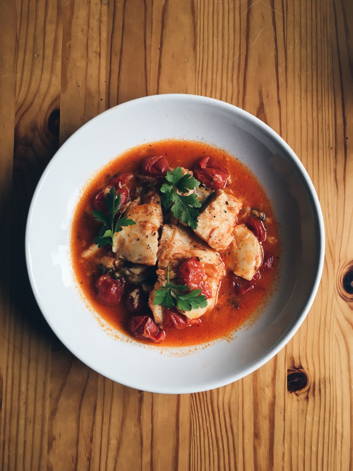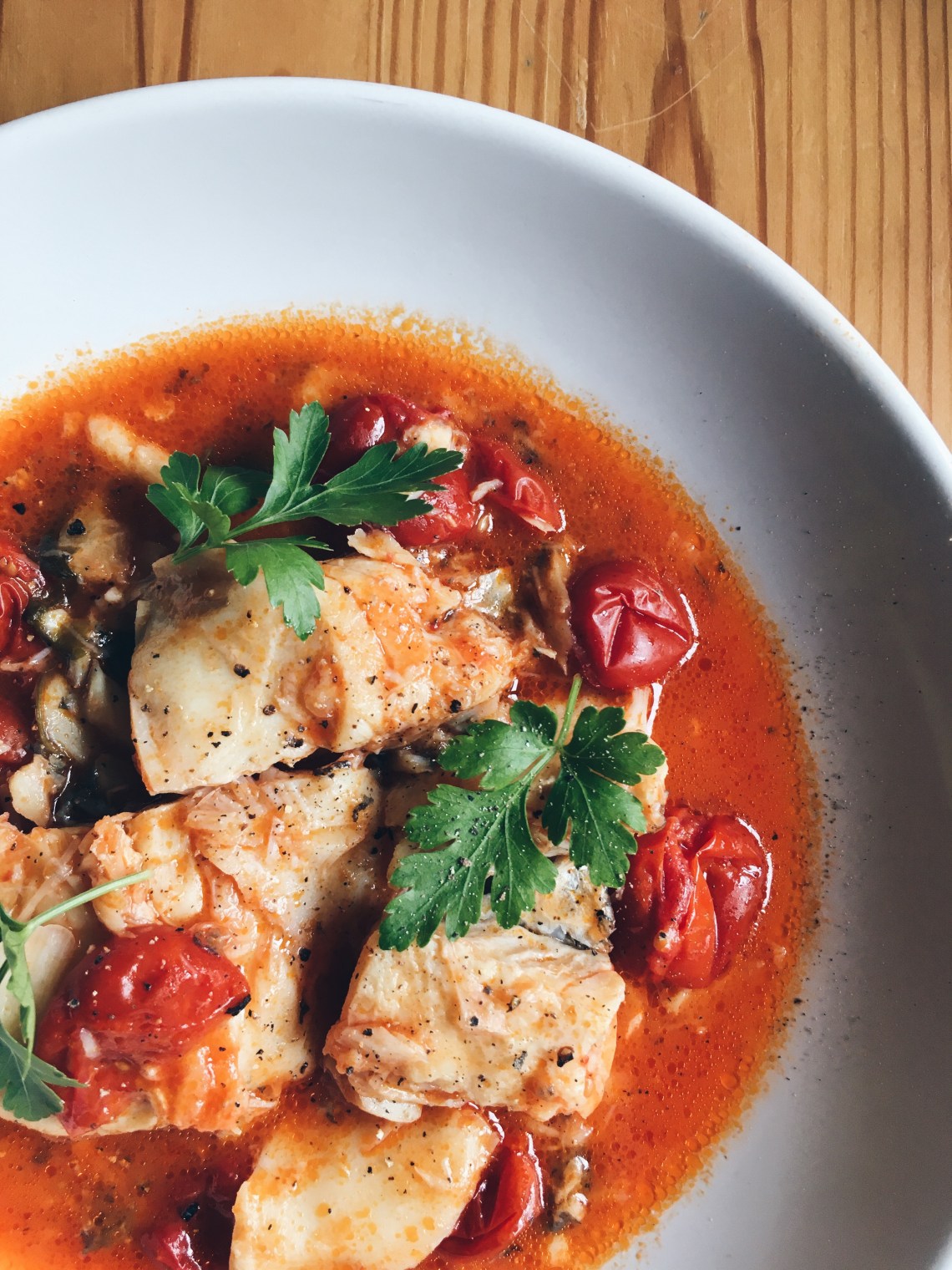 In una casseruola, soffriggi l’aglio passato allo schiaccino; aggiungi i tranci di baccalà dalla parte della pelle e il prezzemolo fresco. Lascia andare a fuoco vivace per 2 minuti. Con l’aiuto di una pinza, gira delicatamente i tranci. Rimuovi la pelle (io la lascio perché mi piace molto) e poi aggiungi i pomodorini. Smuovi la casseruola per “assestare” ed amalgamare il tutto, evitando di usare il mestolo per non rischiare di sfaldare il pesce. Abbassa la fiamma e cuoci con coperchio socchiuso per circa 40 minuti. Aggiusta di sale se necessario*.