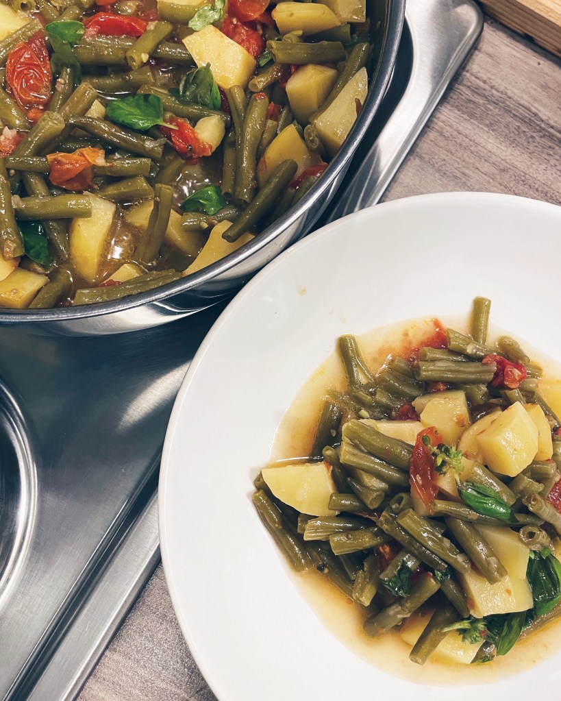 L’estate per me sei tu, tra pochi altri piatti: minestrieddo fasulieddi e patane. Che poesia! Qui in Allemagna mi accontento volentieri dei fagiolini, anche se la ricetta “orighinàl” vuole i fagioli teneri, ancora piatti (qui abbastanza introvabili se non duri e fibrosi). Credo che questa versione con i fagiolini mi piaccia anche più della classica. Servito tiepido (dettaglio fondamentale) e con tanto basilico fresco.