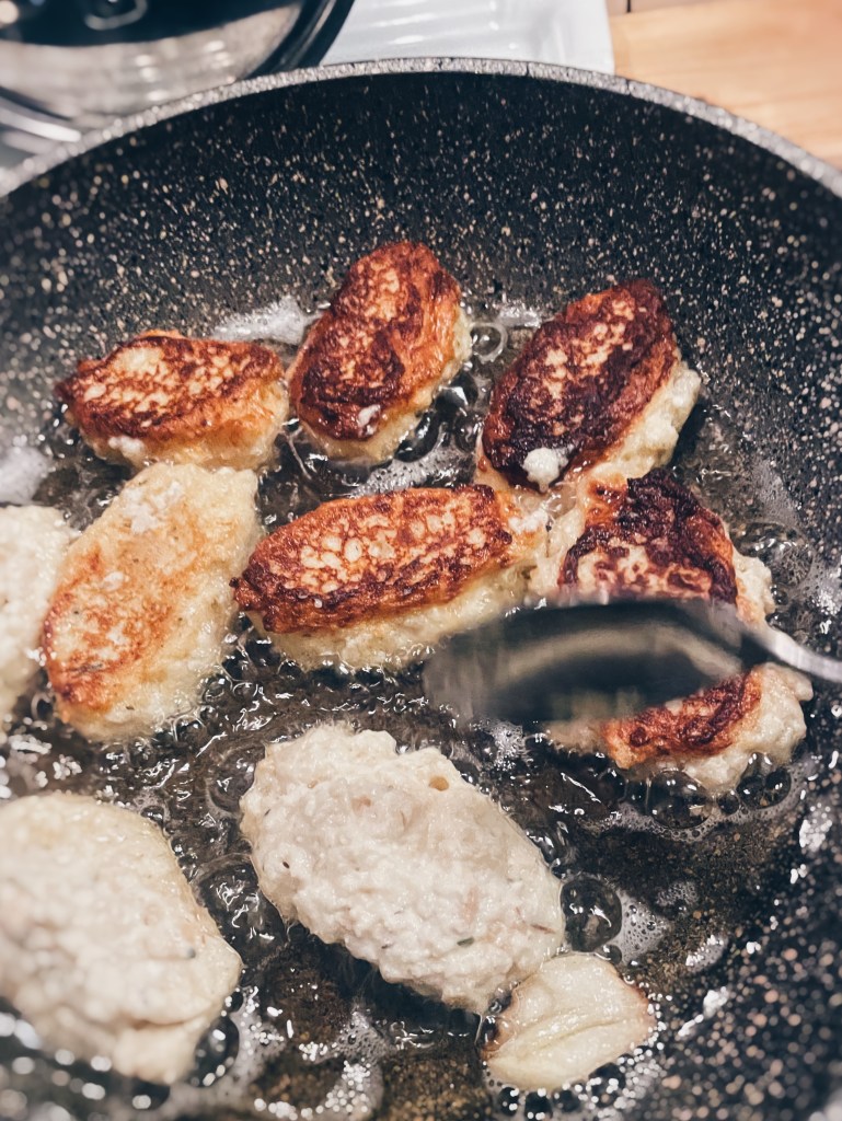 In una terrina metto mezzo pacco (125 g ca.) di Semmel-Würfel Knödelbrot (i dadini di pane secco per preparare i knödel – oppure della semplicissima mollica di pane raffermo, l’importante è che sia tagliata a cubetti piccoli) con del latte intero, un bicchiere o comunque quel che basta a far bagnare bene tutto il pane. Nel frattempo, in un’altra ciotola, sbatto 2 uova in 250 g di ricotta con sale, pepe nero macinato fresco, uno spicchio di aglio tritato, una presa di origano di montagna secco e una grattugiata di formaggio duro (oggi ho usato il cacioricotta di capra ma va bene anche il parmigiano). Passati 5-10 minuti, strizzo il pane dal latte, aggiungo un pizzico di sale e lo metto nel composto di ricotta e uova. Aggiungo una manciata di dadini di pane duri – per dare una nota ancora più cruncky – e lascio riposare 5 minuti. Metto poi a friggere in olio d’oliva insaporito da mezzo spicchio di aglio, formando delle quenelle con due cucchiai, girandole solo una volta e schiacciandole leggermente. Scolo su carta assorbente e servo caldissime, accompagnate da una salsa tzatziki o un semplice jogurt greco, magari condito con olio di lino sale, pepe e sesamo tostato. Bon appétit!