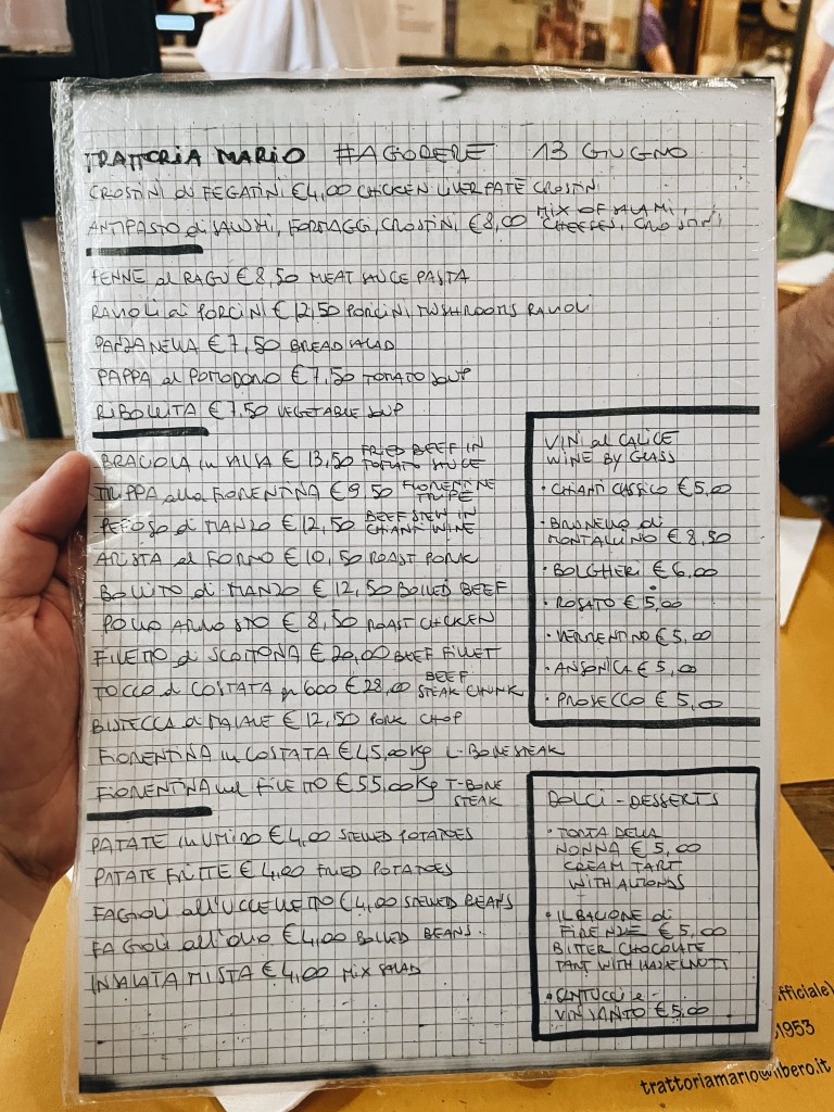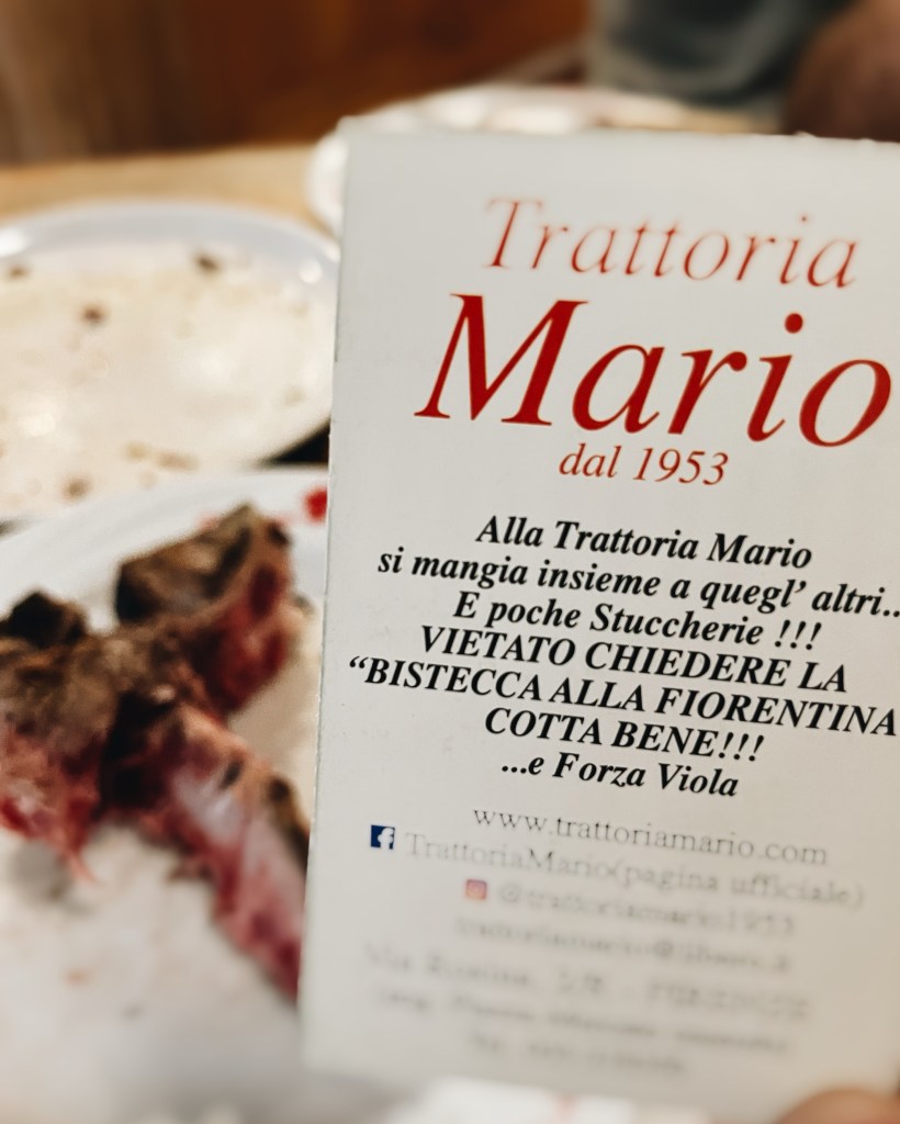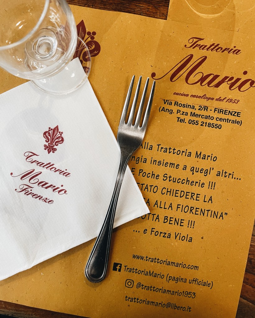 Oggi pranzare da Mario resta un’immersione in un bagno di autentica fiorentinità: il locale, ogni giorno affollato da affezionati clienti e curiosi viaggiatori, preserva la genuinità della tipica osteria fiorentina e il menu, da sempre, muta quotidianamente, seguendo uno schema settimanale che si ripete da anni.