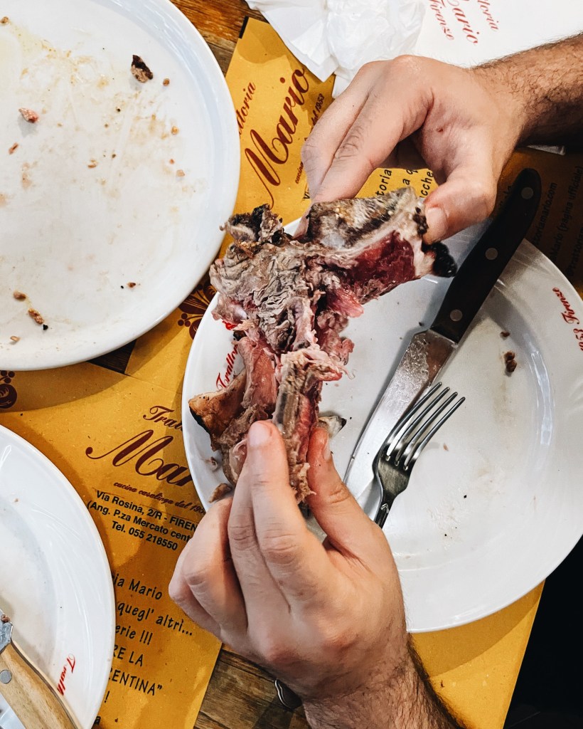 A differenza di tutti i piatti che ruotano quotidianamente, sono fissi e sempre disponibili il ragù, la ribollita e una delle più famose bistecche fiorentine al mondo, che vuole essere accompagnata obbligatoriamente da un ottimo bicchiere di vino rosso della casa. Il tipico piatto di ciccia qui è cucinato a regola d’arte e, ça va sans dire, viene servito solo cotto al sangue! Non ci provate proprio a chiedere un’altra cottura… d’altronde l’è così che si mangia qui!
