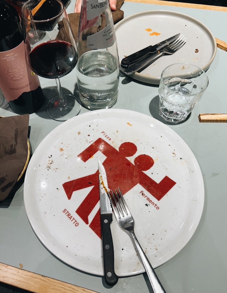 A danzare discreto tra i tavoli troviamo un ineccepibile Emanuele Ferolla, food and beverage manager e sommelier che ci decanta una carta dei vini davvero inusuale per una pizzeria, poiché essa spazia tra tante e diverse tipologie, rendendo la scelta davvero difficile – ma la possibilità della mescita al calice è, senza dubbio, una nota positiva che pemette a tutti i commensali di poter intraprendere il proprio personale viaggio alla scoperta dei sapori della cucina. Noi, però, ordiniamo senza indugio, una bottiglia di Macchi, un Rosso Campania della Cantina TreDaniele, realtà brillante di Trentinara che abbiamo scoperto da non molto e che continuiamo a degustare appena ne abbiamo occasione. Il Macchi si distingue subito per la sua eleganza e struttura: con il suo colore rubino intenso con sfumature violacee, capiamo fin dal primo sorso che è la scelta perfetta per accompagnare il nostro viaggio “strattoso”, grazie ai suoi profumi vegetali e fruttati, arricchiti da note di erbe aromatiche, prugna, amarena e spezie dolci.