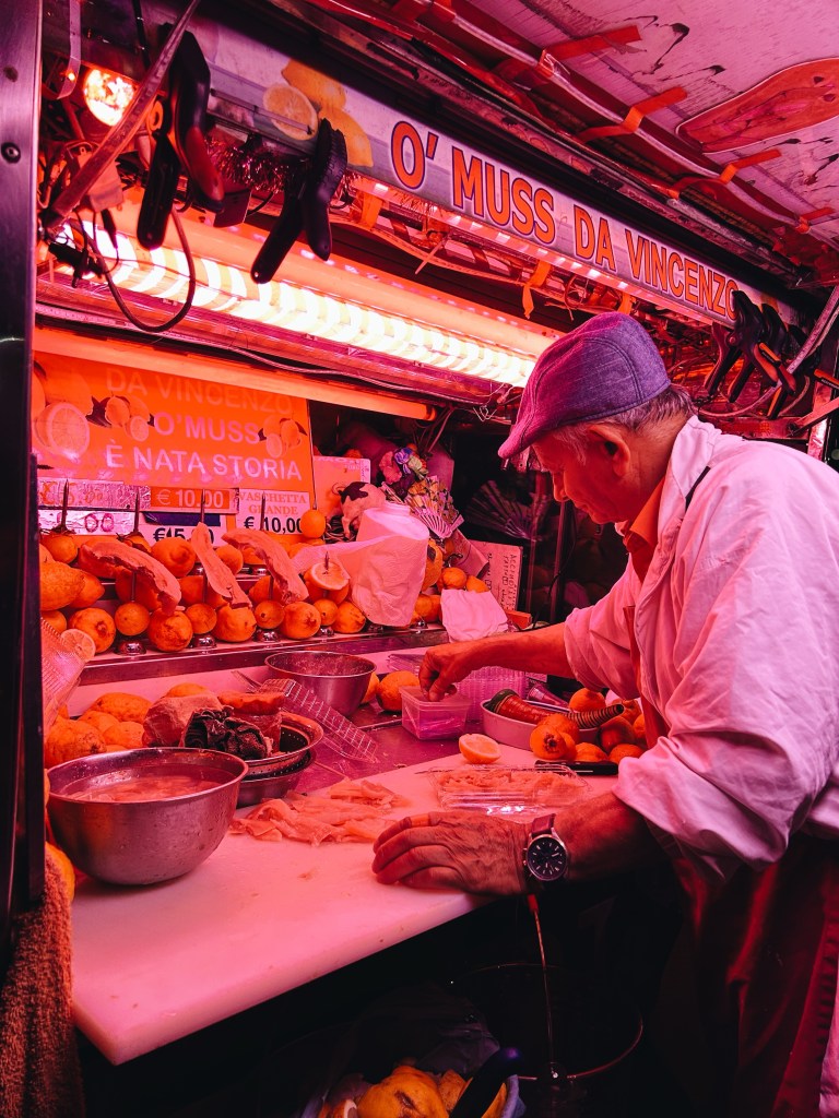 Ma se ci spostiamo dalla macelleria alla strada, a quel fiorino che vende ’o pere e ’o muss, quella stessa luce rossa prende un altro senso. Non c’è vetrina, né esposizione da banco. Niente confezioni, niente atmosfera modificata. Solo pezzi di frattaglie su taglieri bagnati, coltelli e arrotini, sale che esce da corni bianchi, limoni, limoni, limoni. Lì, la luce rossa non serve a valorizzare, non esalta, non maschera. Stordisce.