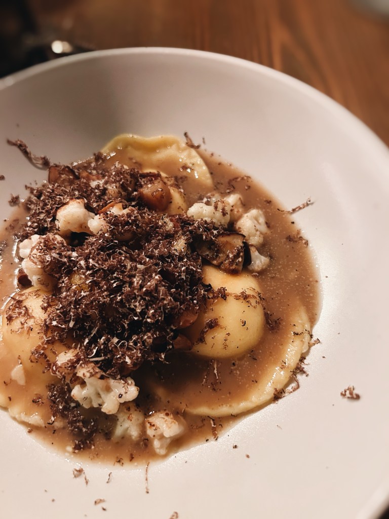 ➖ Ravioli di ricotta, porcini, cavolfiore, tuorlo, tartufo nero 🎵 “Disorder” — Joy Division