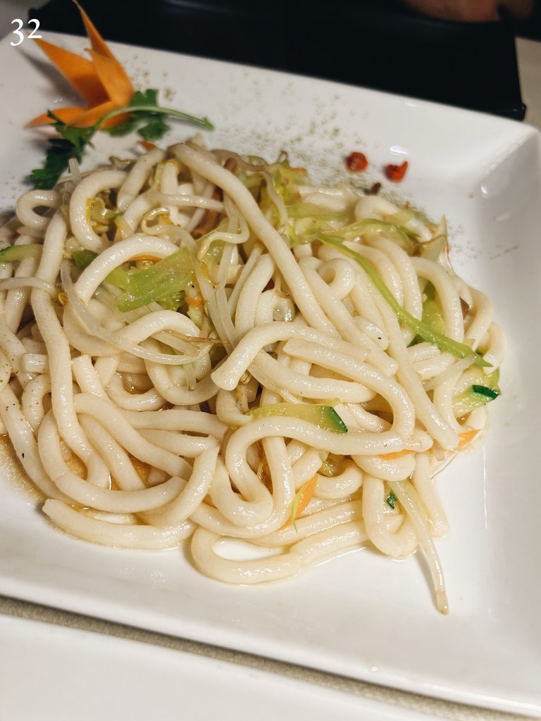 Dentro questa cornice, i piatti parlano da soli e vanno tutti nella stessa direzione. Le Melanzane piccanti della Signora Tzao (39) sono il piatto che da solo vale il viaggio: melanzane setose, salsa piccante calibrata, profondità e comfort allo stato puro. Il Wok di lombrichelli freschi “Udon” con tè verde “Gao Shan” e verdure di stagione (32) è un salto di wok pulito e aromatico: pasta fresca masticabile il giusto, verdure croccanti, tè che lega e rinfresca. Il Cestello di ravioli al vapore ripieni di gamberi (10) gioca sulla finezza: sfoglia sottile, ripieno dolce-sapido, bocconi netti e precisi. Il Pollo del Generale Zhong Tang (49) è godurioso ma non ruffiano: croccantezza, agrodolce misurato, zenzero a fare da spina dorsale. Il Petto di anatra alle cinque spezie (45) è una lezione di equilibrio: pelle croccante, carne morbida, speziatura presente ma elegante.