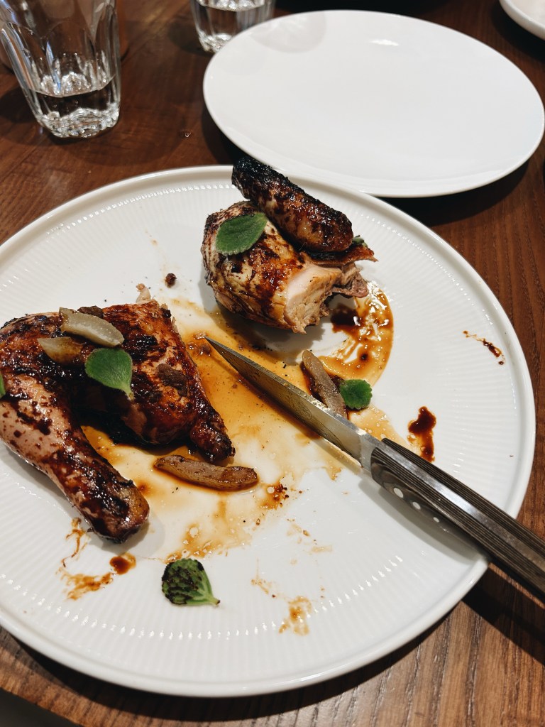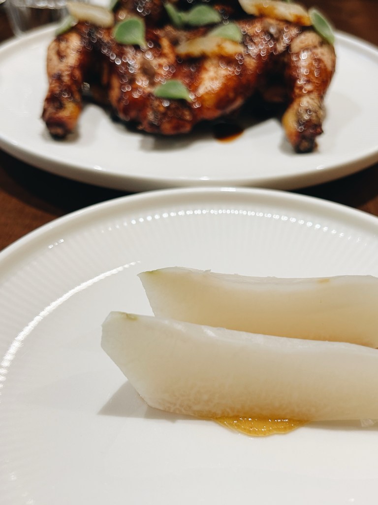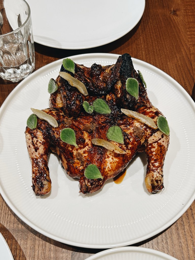 Il polletto alla brace chiude in una devastazione inaspettata: l’olio di fico, l’origano cubano e il chayote su marmellata di sudachi lo tirano fuori dalla romanità ortodossa, con sapori che si stratificano su un equilibrio chirurgico tra dolce vegetale e affumicato da brace. È un colpo che disorienta — non per forza in un’accezione negativa.