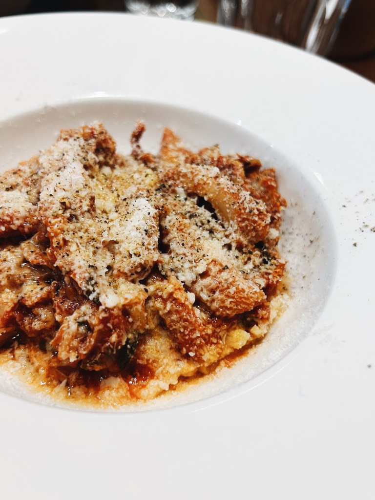 La trippa alla romana, che conserva intatta la memoria della domenica popolare — ma già qui qualcosa sposta il registro classico, con una freschezza nascosta ma allo stesso tempo possente, che si nasconde nella consistenza perfetta della carne e affoga nel pomodoro e nel formaggio.