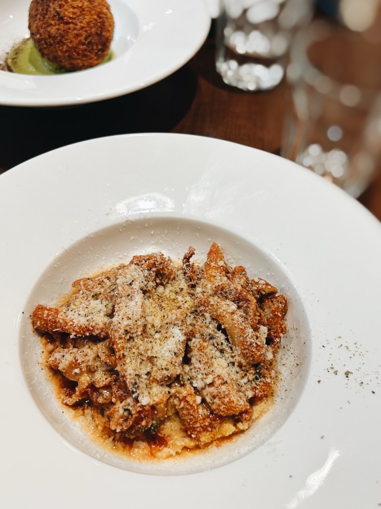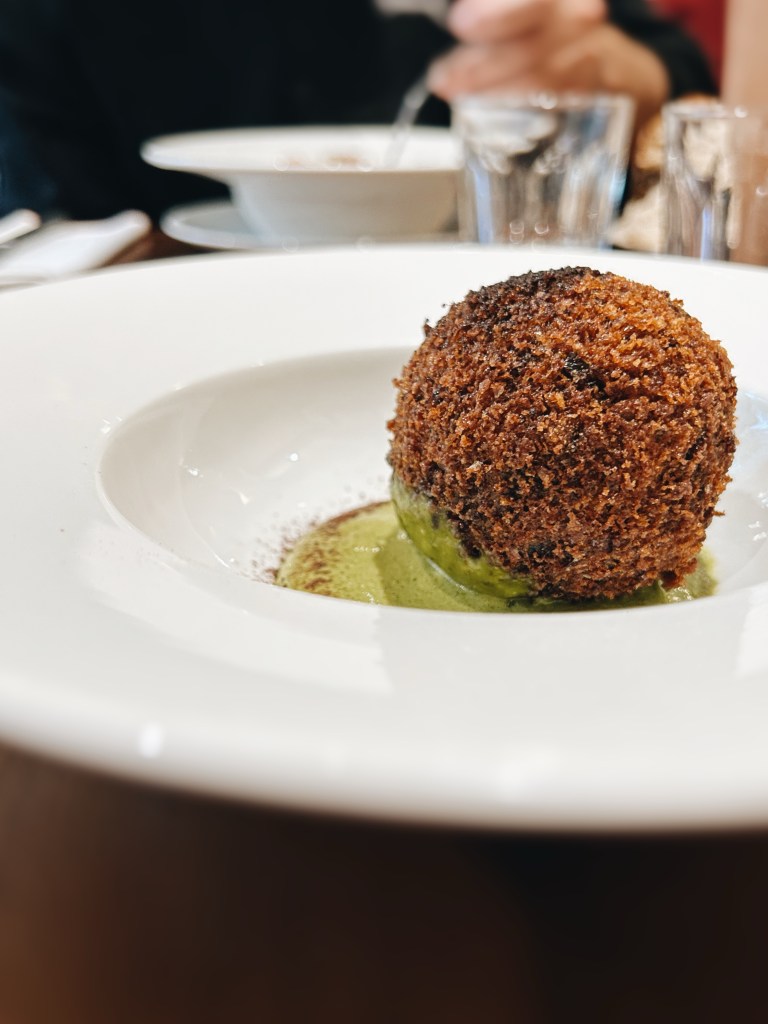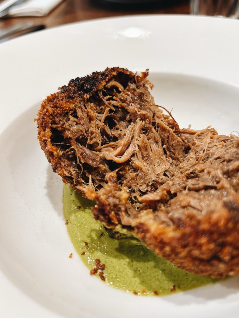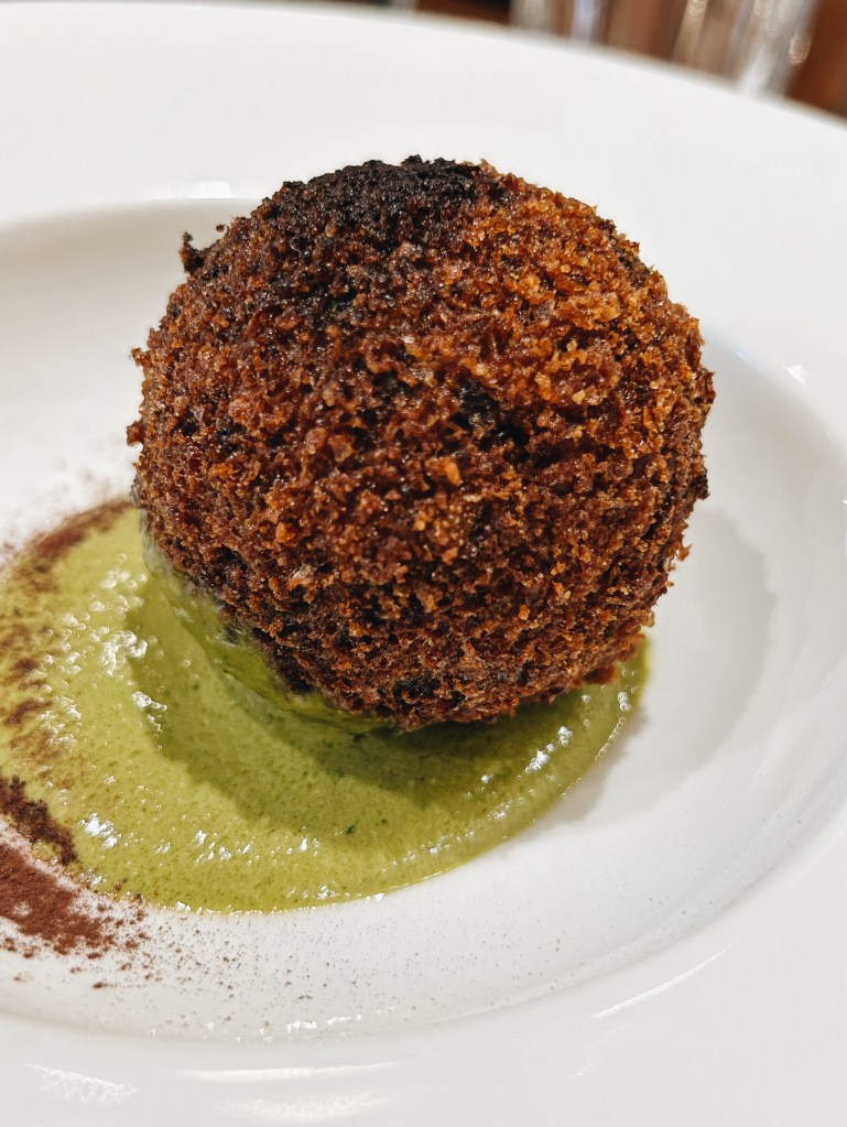 La polpetta di coda alla vaccinara con salsa di arachidi ribalta il piatto di trattoria in una detonazione controllata: interno scioglievole, crosta che frana sotto i denti, l’arachide solleva la scena come un riff fuori scala in una canzone che conoscevi a memoria.